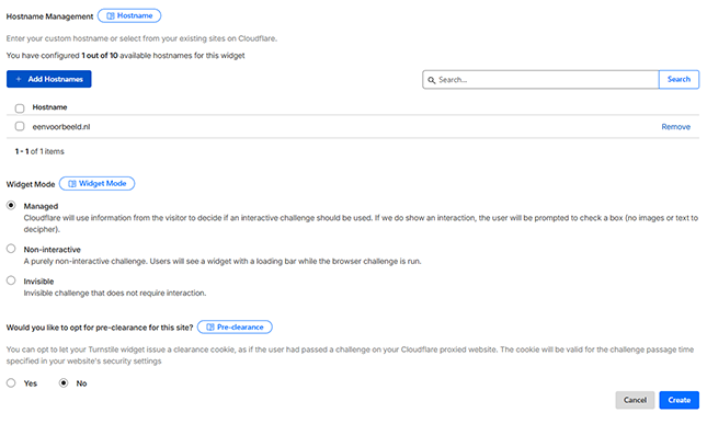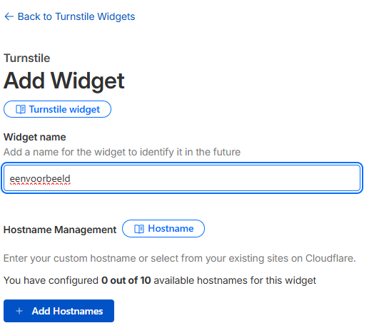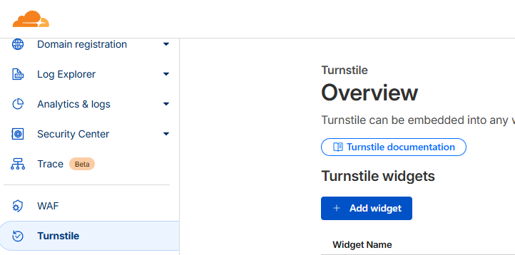 Eenmaal ingelogd op Cloudflare kies je in het menu voor Turnstile en vervolgens voor Add widget