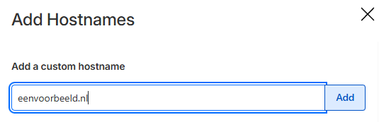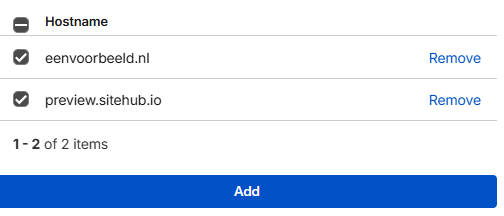 Vul bij hostname eerst preview.sitehub.io in, klik op add en voeg vervolgens de eigen domeinnaam in. In ons voorbeeld hebben we eenvoorbeeld.nl als hostname opgegeven.