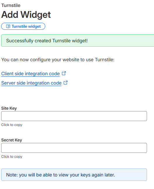 Zoals je ziet moeten we nu een Site key en Secret key invullen. Deze verkrijgen we door een widget aan te maken bij Cloudflare. Ga naar https://dash.cloudflare.com/ log in of maak een nieuw account aan.